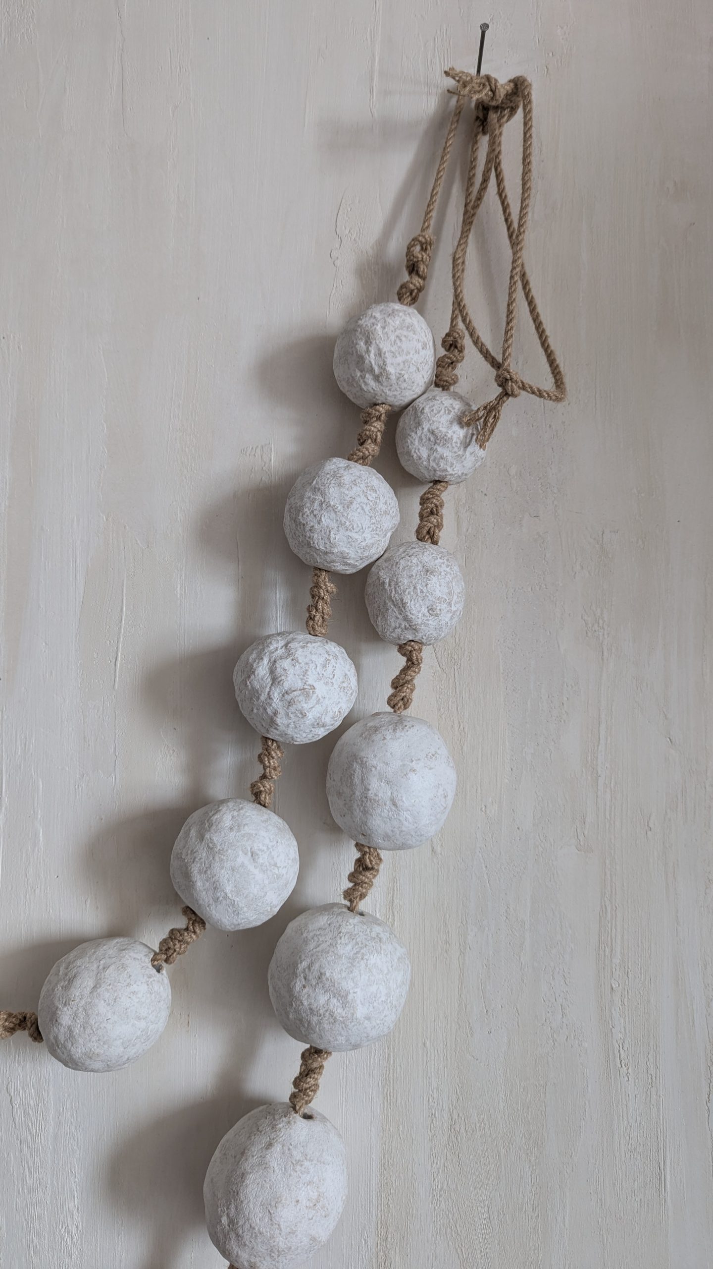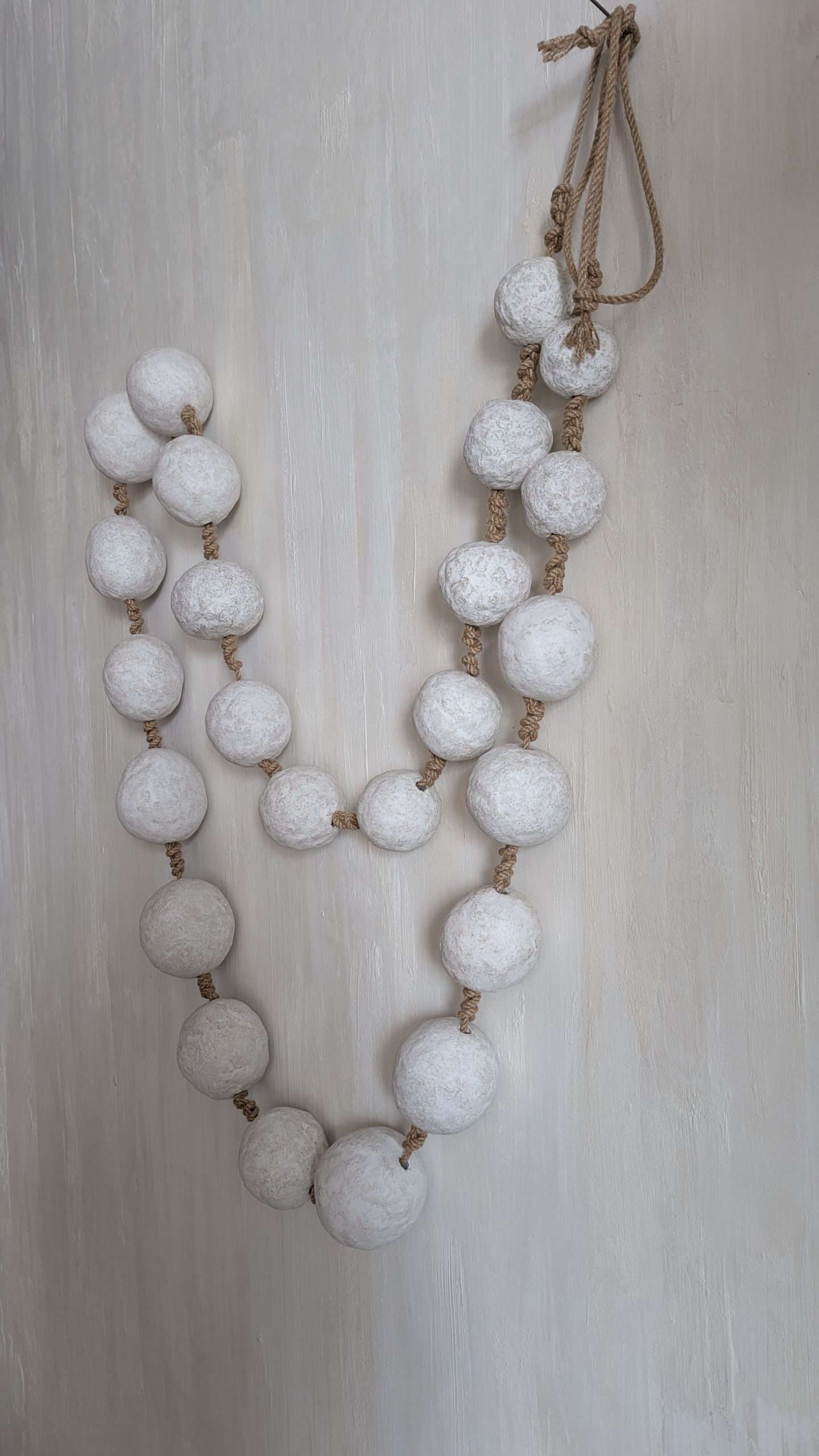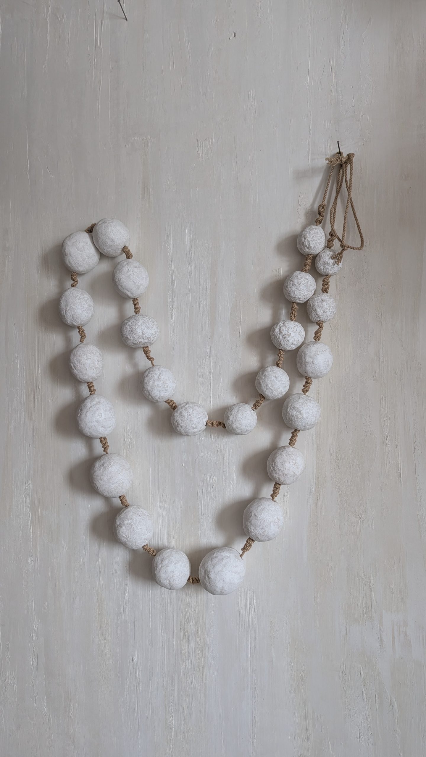 Велике декоративне намисто для стіни — це оригінальний елемент інтер’єрного декору, який додає простору затишку та природної естетики. Великі фактурні намистини у світлому кольорі поєднані з натуральним джутовим шнуром, що створює гармонійний вигляд і підкреслює сучасний мінімалістичний стиль. Такий декор чудово доповнює інтер’єри у стилях скандинавський, мінімалізм, бохо, рустик та еко. Намисто можна розмістити на стіні, декоративному гачку. Воно стане стильним акцентом у вітальні, спальні, передпокої або фотозоні. Завдяки універсальному дизайну декоративне намисто легко поєднується з іншими елементами декору: вазами, кошиками, текстилем або сухоцвітами.